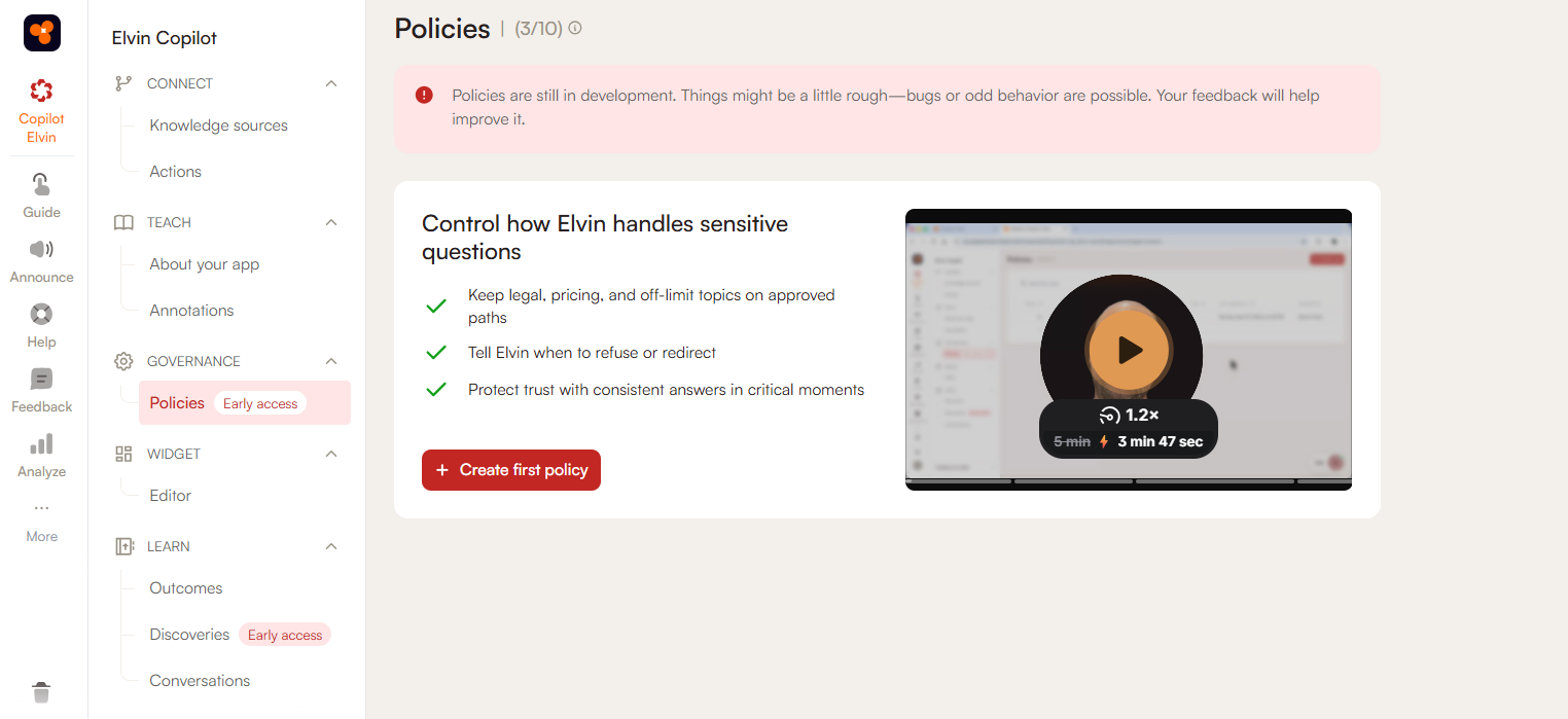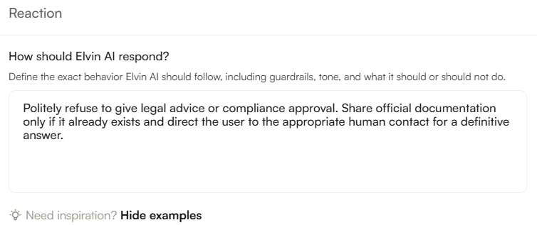 Policies define how Elvin behaves when a specific sensitive or high-risk topic comes up in a conversation. Instead of letting Elvin respond freely, you set a rule that tells it exactly what to do: refuse, redirect, or point the user to an approved source or contact. Policies act as a guardrail, and work best for topics like legal guidance, pricing, contracts, compliance, security, or other areas where the user should consult another source