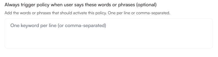 In many cases the trigger description alone is sufficient. Add keywords when the trigger is broad and needs reinforcing, when certain phrases should reliably activate the policy, or when you want to reduce the chance of accidental matches.
