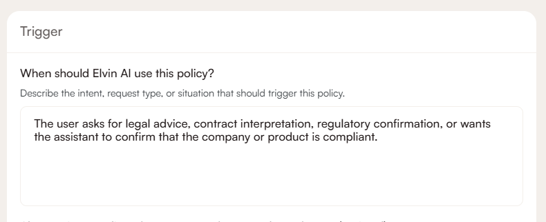 The trigger describes the situation that activates the policy. Write it in plain language based on what the user is trying to do, not the exact words they might type. Elvin uses the trigger to recognize intent, so it will match variations in phrasing as long as the underlying situation matches.