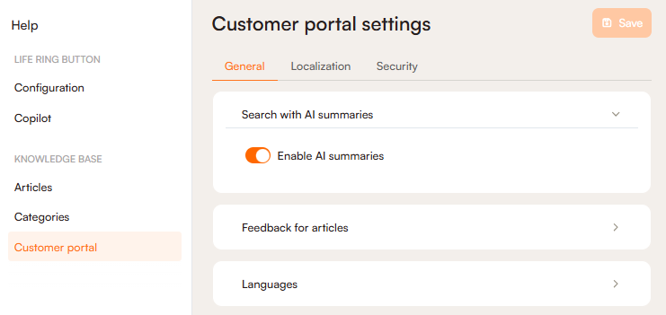 You can disable the AI Summary feature using two separate toggles: one located next to the Life Ring Button and the other in the Customer Portal settings.