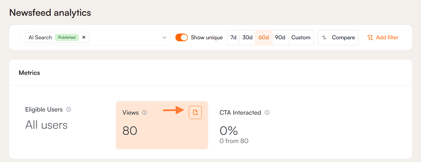 This metric shows the total number and percentage of users who interacted with the Call to Action (CTA) button, based on all users who were presented with it. Similar to Views, you can see both the total and unique number of users who interacted with it. You can also view and export the list of users by accessing the menu in the upper-right corner.