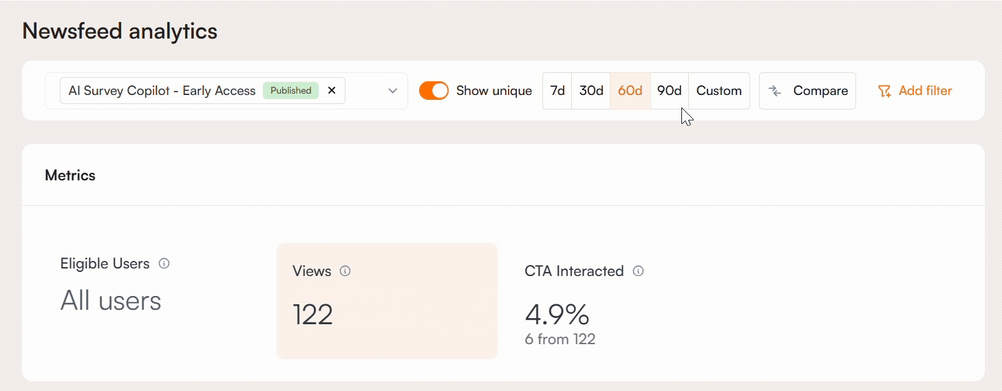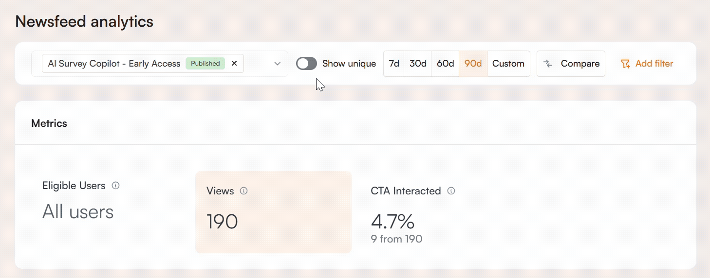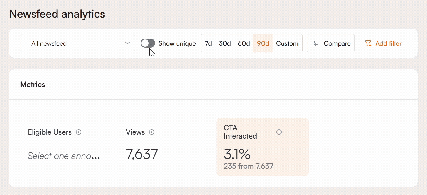 On the right side of the dropdown list, you’ll find the Show Unique toggle. When this toggle is off, the metrics display the total number of views and interactions, including multiple interactions from the same user.