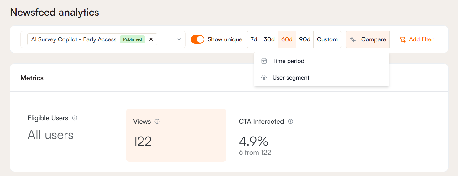 - User Segment: This option allows you to select two distinct groups of users and compare how each group interacted with the announcement item. This is useful for identifying differences in engagement or behavior between segments, such as new vs. returning users.