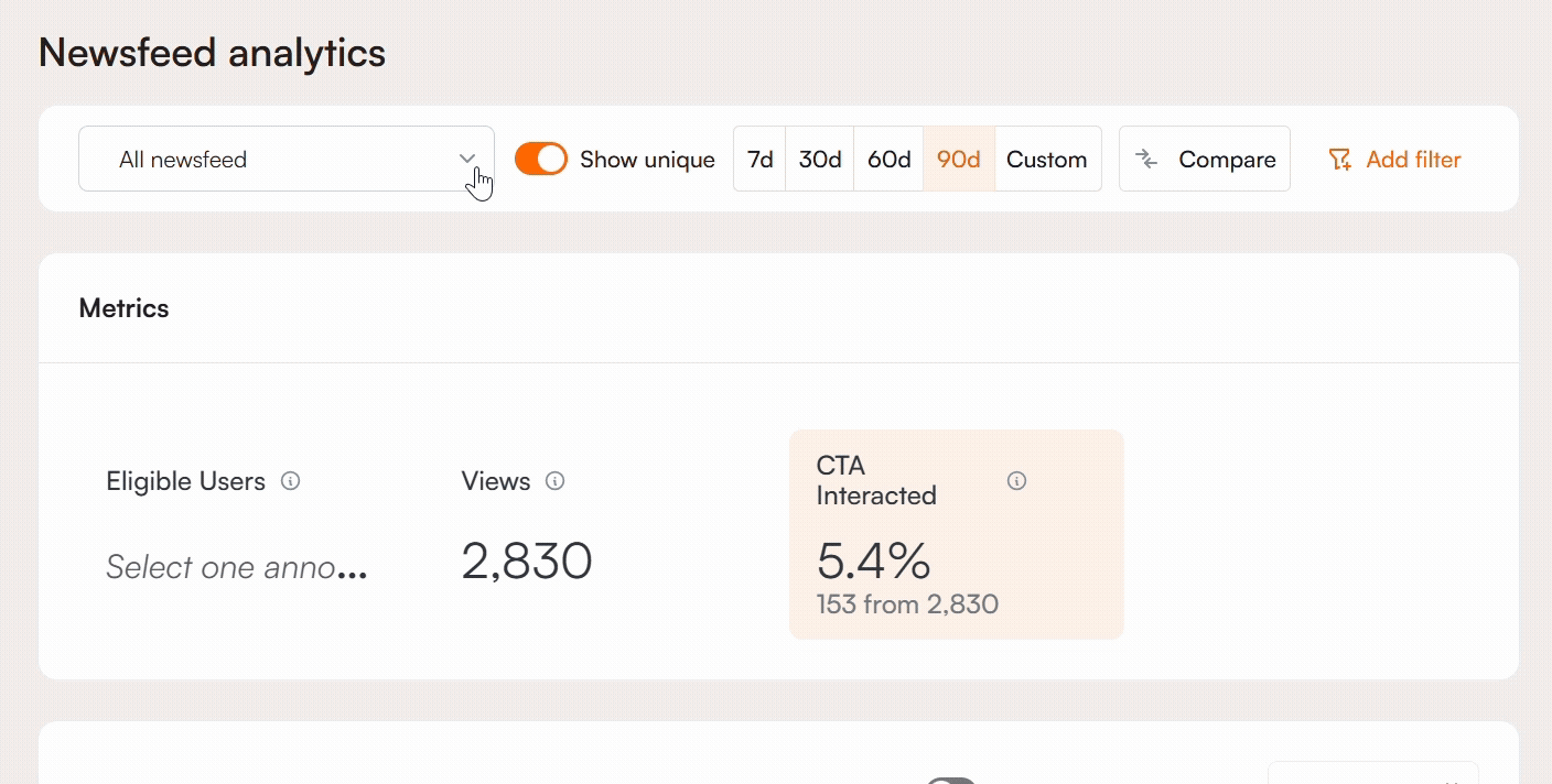 - Time Range: This option lets you compare the announcement’s performance over two different time periods. For example, you can see how metrics from the past week stack up against the previous week, helping you understand trends and changes over time.