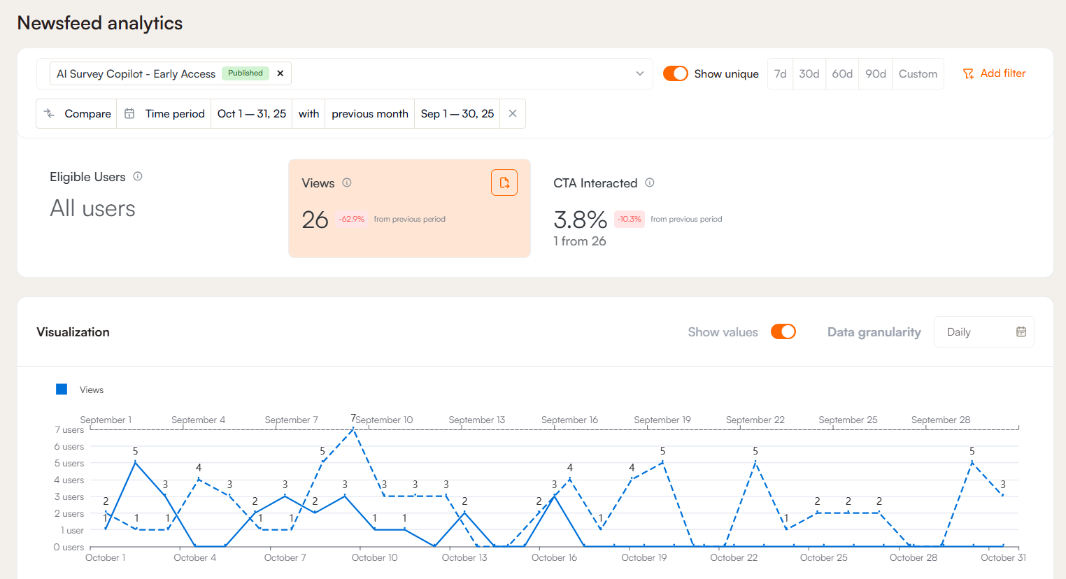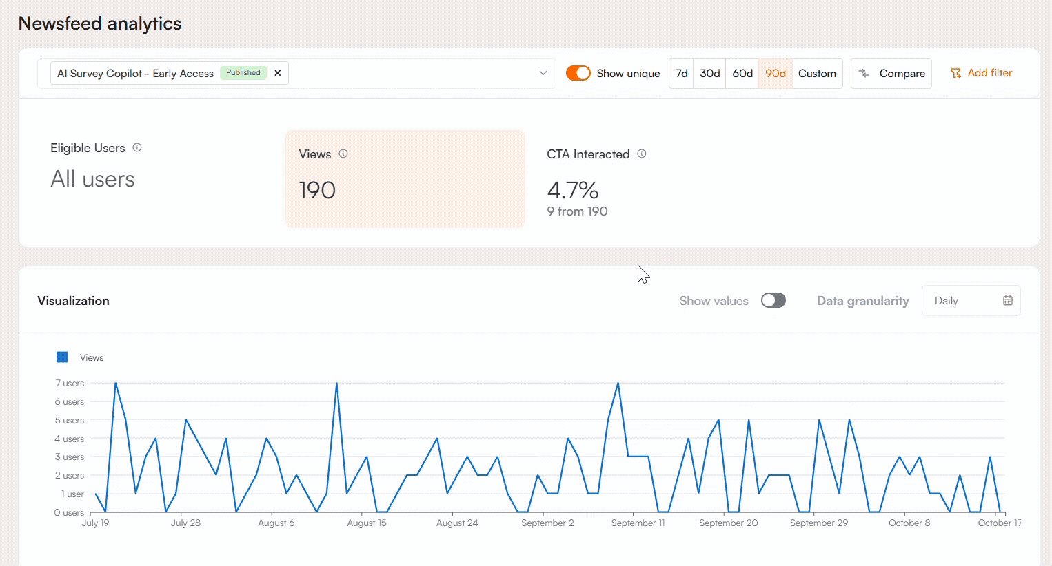 The View section shows either total views or unique views for the selected time period, depending on your settings and whether the Show Unique toggle is on or off. It refers to the number of users who viewed and dismissed the announcement item without clicking the CTA.
