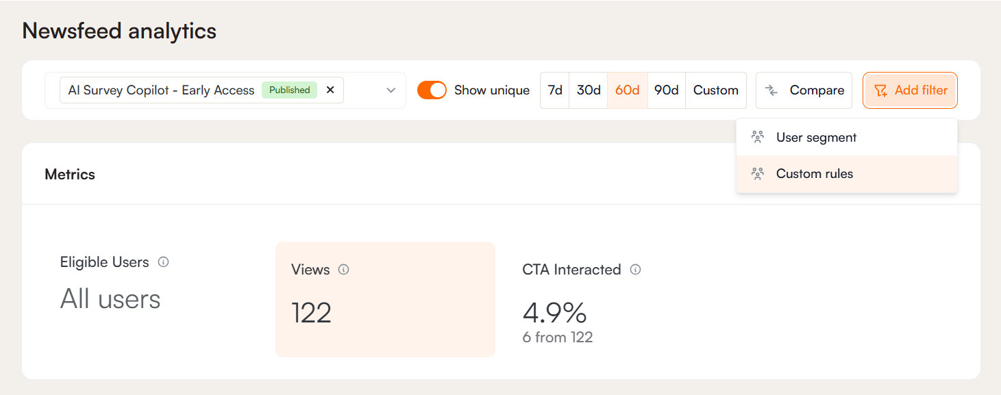Custom Rule Filters: With custom rules, you can filter users based on specific conditions from user data or inbound parameters. For example, you can filter by role, signup date, actions during a tour, or interactions with certain content. This allows you to see how different groups of users engage with your content and view detailed metrics for each group.