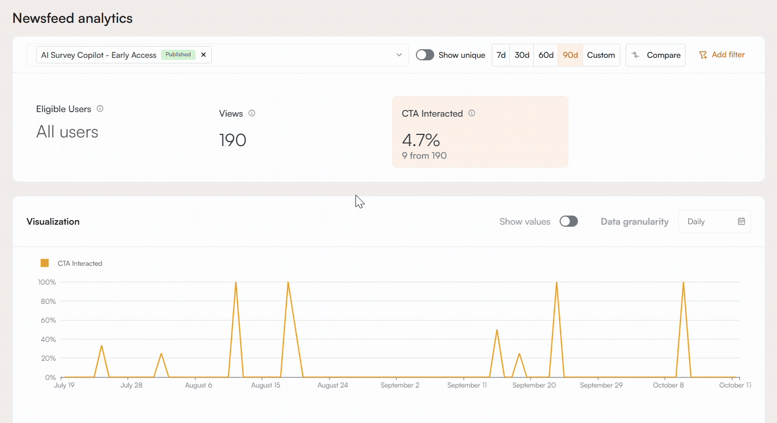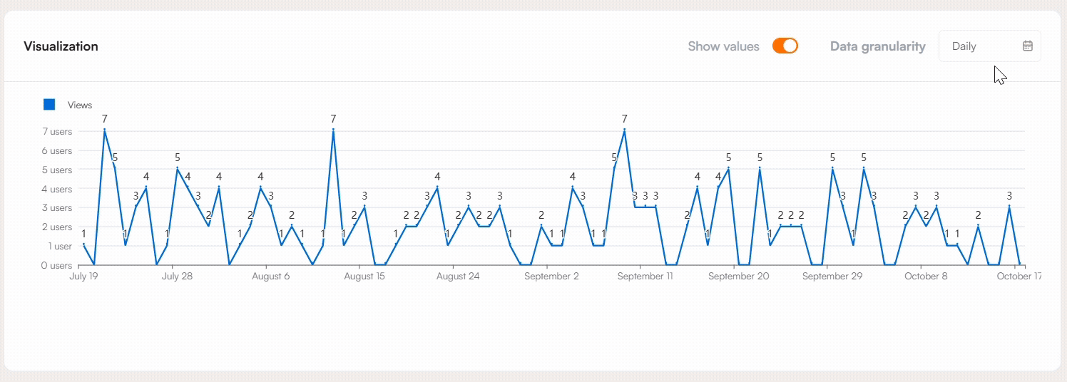 The Show Values toggle can be used to display either the number of viewers, if Views is selected, or the percentages directly on the graph. If CTA Interacted is selected, you can still view the number of viewers by hovering over a line, which will show the exact number of users or views at a specific point in time. This makes it easier to analyze detailed data within the graph.