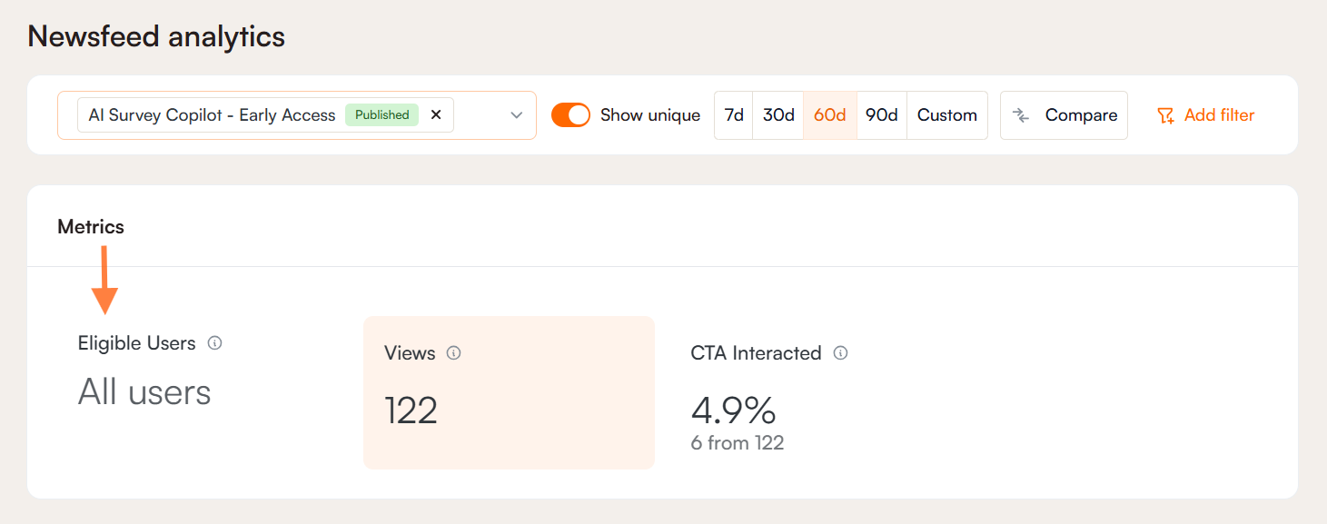 Note: This value is only displayed when a single announcement item is selected. If multiple announcements are selected, the metric is not shown because each announcement may have different targeting rules. In such cases, there is no straightforward way to calculate a meaningful total.