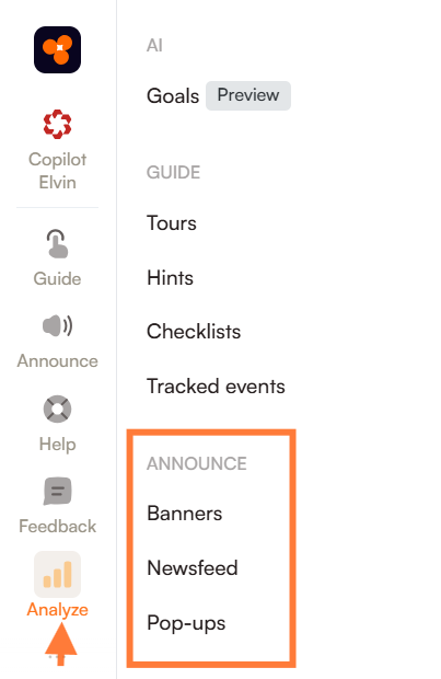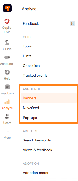 - Under the Announce section, select the type of announcement (Pop-up, Newsfeed, or Banner) you want to view analytics for.
