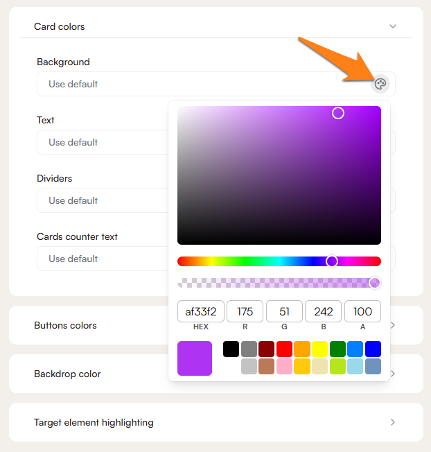 - Color: Defines the background overlay color that appears behind the tour card to dim the rest of the interface.