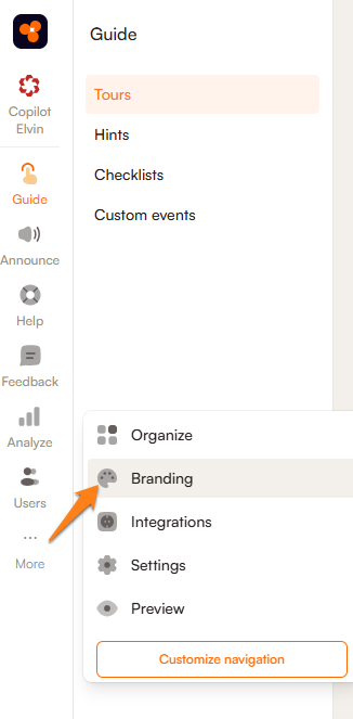 Unlike surveys and announcements, onboarding tools such as tours, hints, and checklists cannot be styled directly in the content editor. However, you can still change the color of the cards and buttons to match your branding. To customize their appearance, go to the More menu and select Branding.