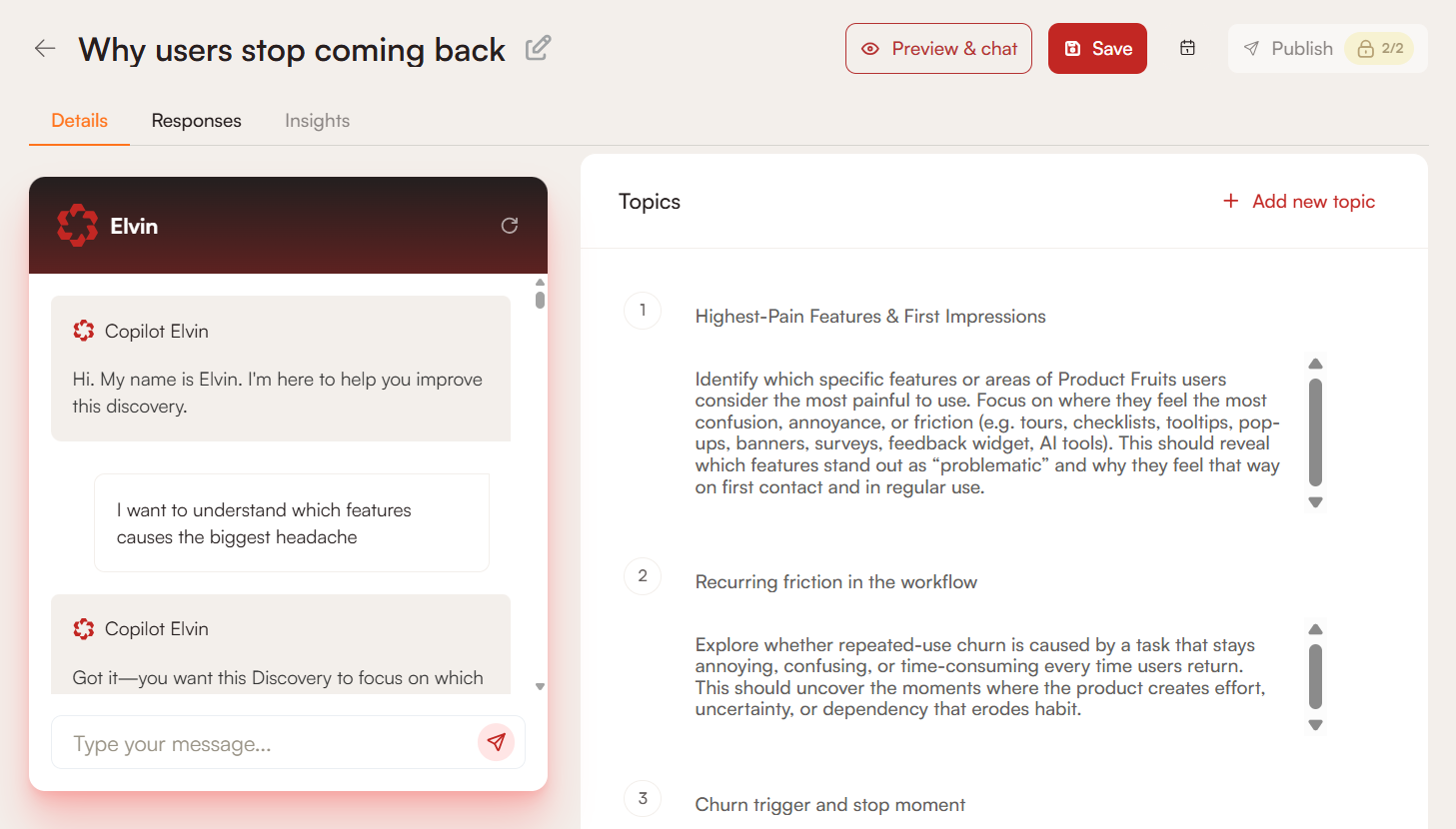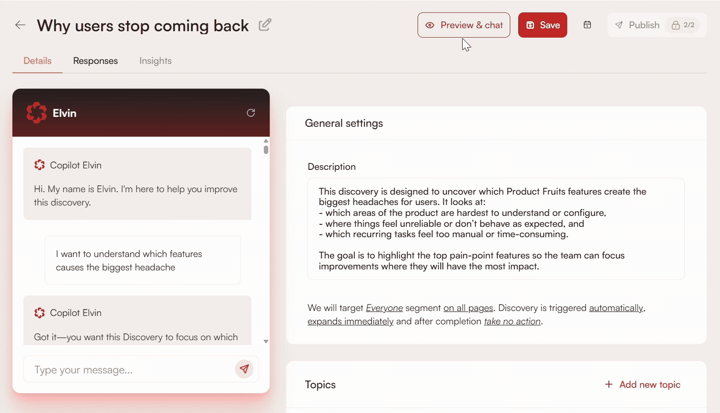 Topics define the main research angles Elvin should cover during conversations with users. Each topic has a title and a short description that guides how Elvin approaches that angle with each user.