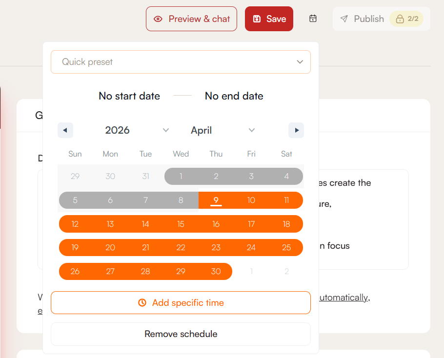 Set a specific time period during which the Discovery appears to users. You can select a fixed time zone or use each user's local time zone. The local time zone option is useful for international audiences, as it ensures the Discovery runs for the same duration for every user regardless of their location. If no time zone is selected, UTC applies by default.