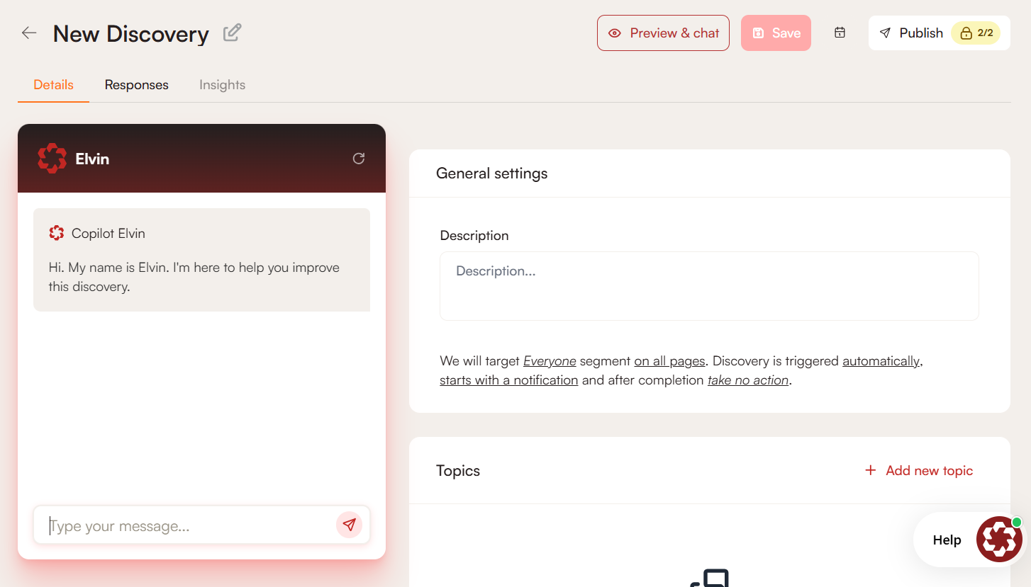 Discoveries are conversational, which means the experience is harder to judge just by looking at the setup. The preview shows exactly how the Discovery will appear to your end users: the questions Elvin asks, the tone, and the flow. Based on your experience, you can adjust the topics before releasing it to your users.