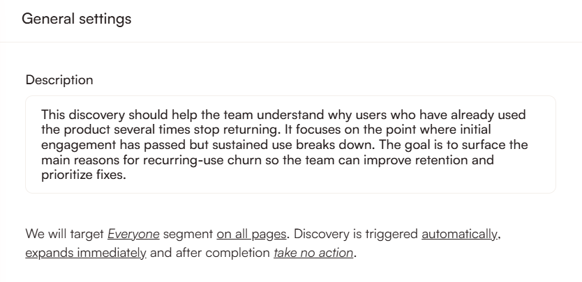 The description defines the aim and purpose of the Discovery, what you want to find out from your users. If you are writing this from scratch, be as detailed as possible: what you want to know, what the goal is, and what the findings should help with.