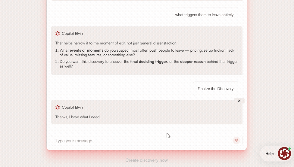 Discoveries work differently. You tell Elvin upfront what you want to track and learn. From there, Elvin asks contextual follow-up questions based on each user's answers, digging deeper into the topic.