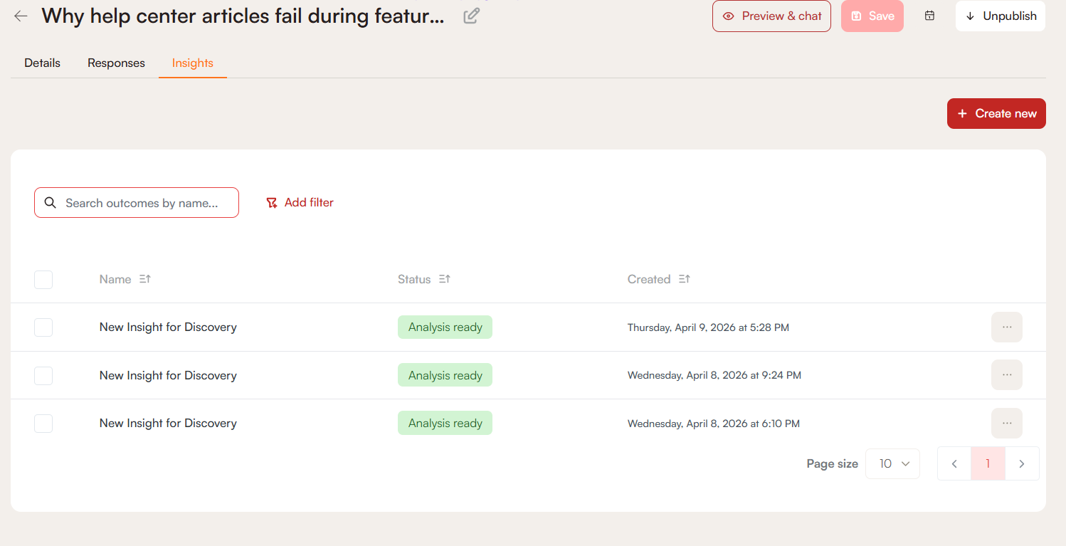 Discoveries can turn collected responses into an AI-generated insight report. You can generate one, re-run the analysis, or view the last generated report from the Discovery detail page or from the Responses tab.