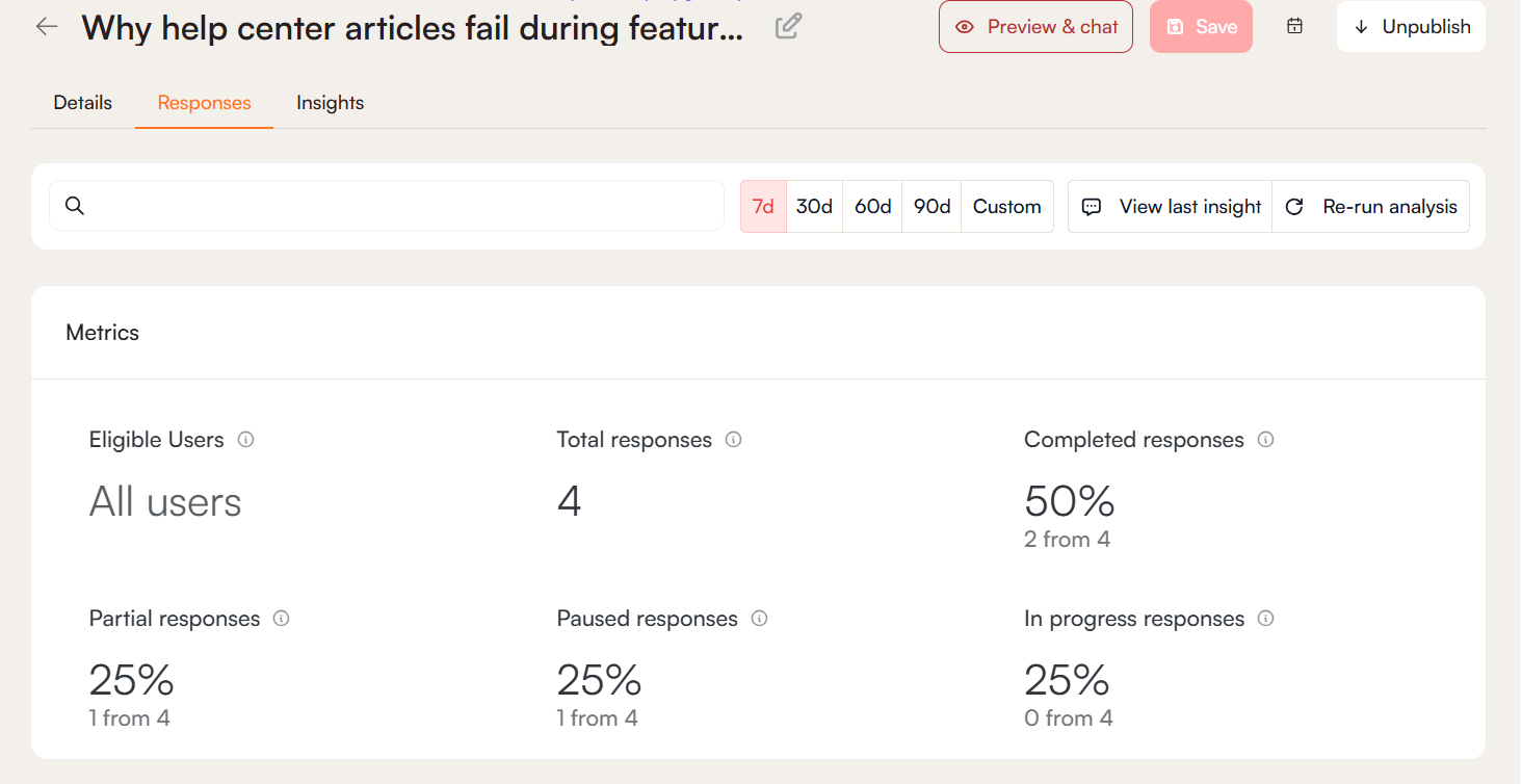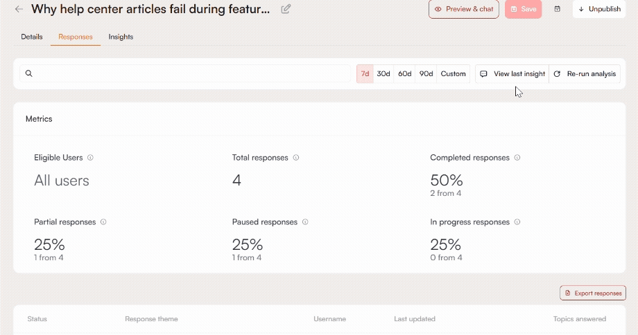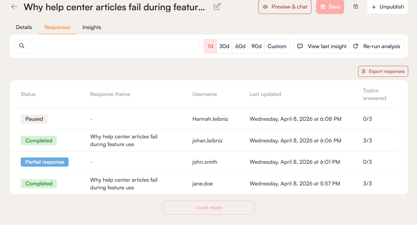 The Responses tab is where you can review how users interacted with your Discovery, track completion rates, and dig into individual conversations.
