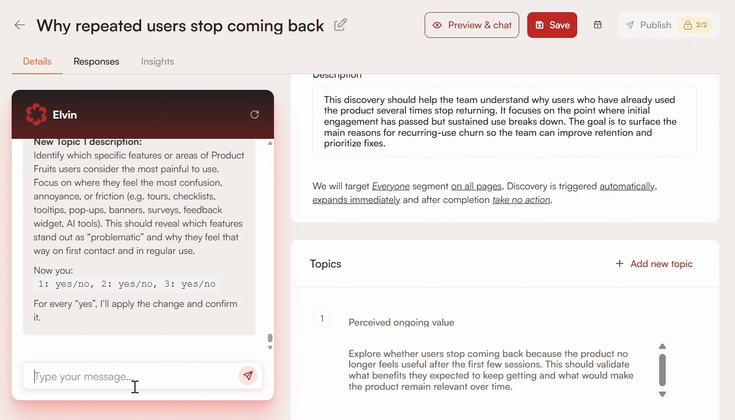 The Elvin chat panel lets you converse with Elvin directly while setting up your Discovery. As you provide more context, Elvin updates the description or suggests changes to your topics, including adding new ones. Before applying any changes, Elvin always validates with you first.