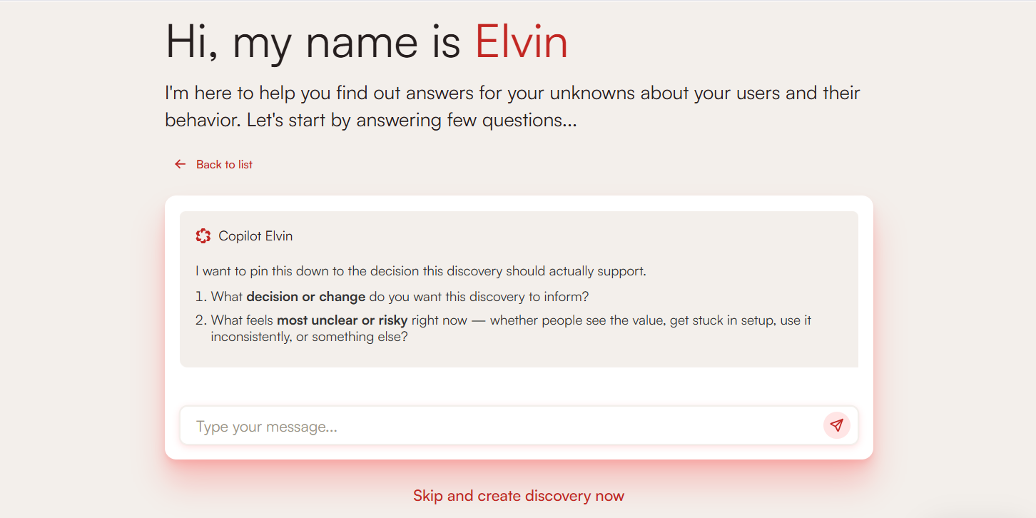 Discoveries help you run AI-assisted user research directly inside your product. Instead of building a static questionnaire, you describe what you want to learn and Elvin handles the rest: generating a focused Discovery, asking conversational follow-up questions that adapt to each user's answers, and turning the collected responses into AI-written insight reports.