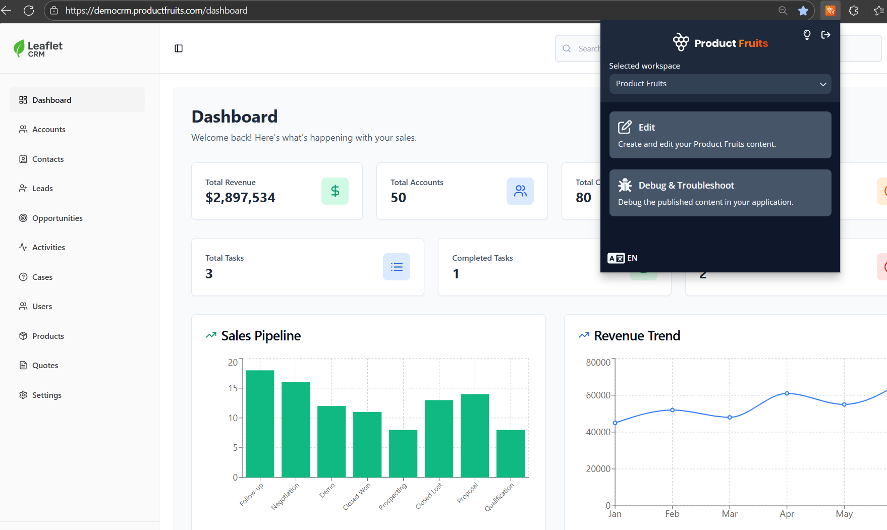 - Once the application has loaded, click on the extension icon in the upper-right part of your browser. If you are not logged in, enter your Product Fruits credentials.