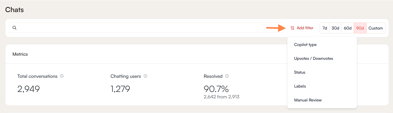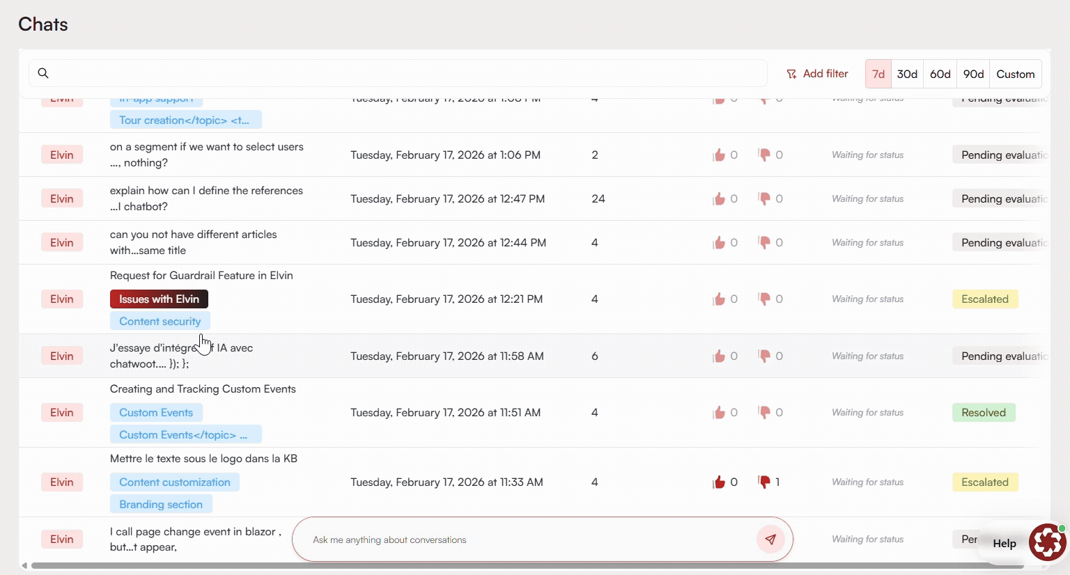 - Status: Filter by conversation status: resolved, escalated, or pending evaluation.