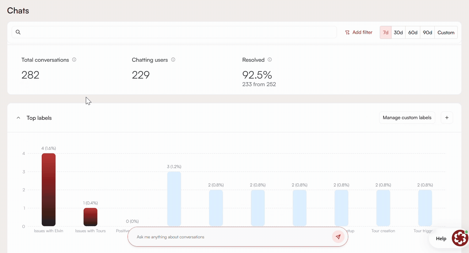 Labels are tools that categorize conversations so you can understand what topics are being discussed and how those topics change over time. This feature works by Elvin AI interpreting and assigning labels to conversations after they are closed (either Resolved or Escalated), 24 hours after the last message.