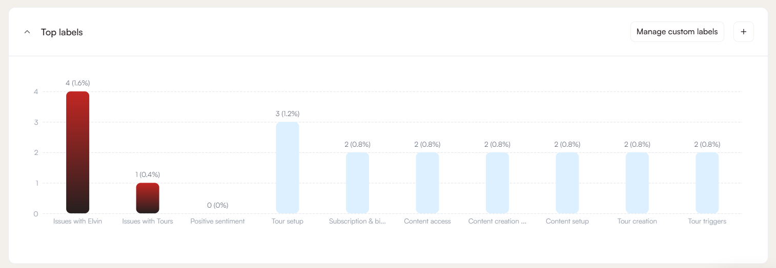 Top Labels is a histogram showing the most common labels for the selected time period. Custom and Automatic labels are shown separately with Custom labels being positioned first.