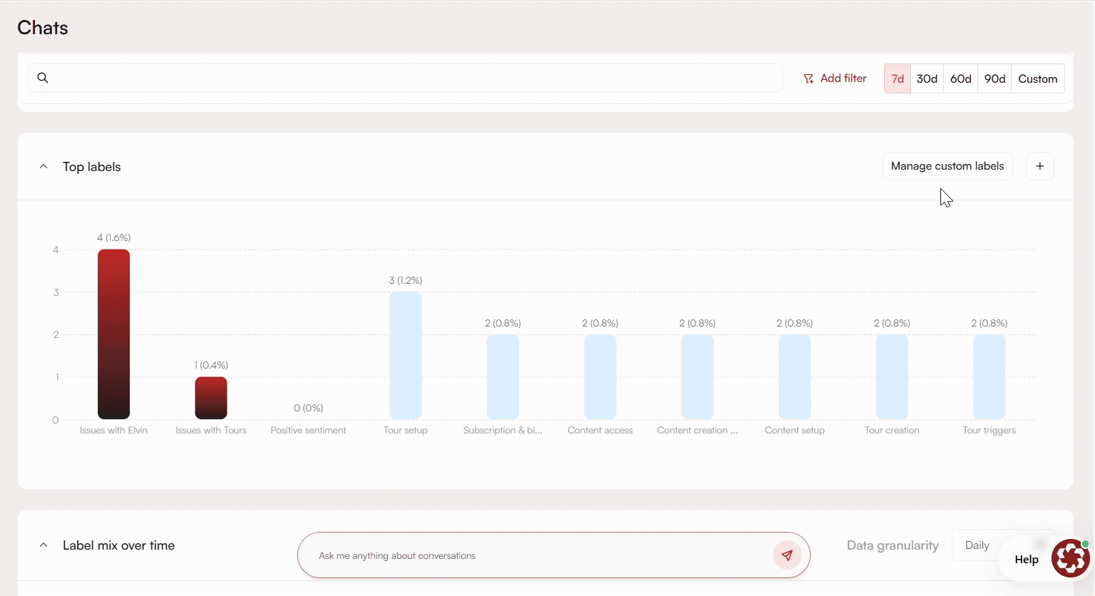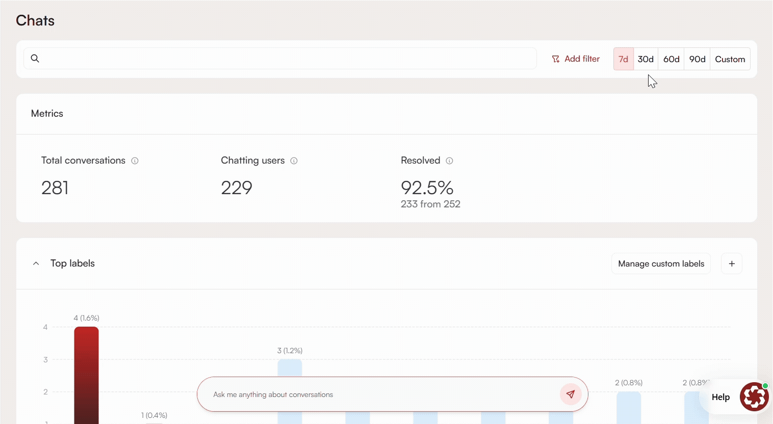 - Labels: Filter by one or more labels, either automatic or custom, to surface conversations around a specific topic or issue