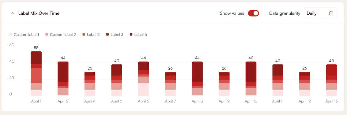 Label Mix Over Time is a stacked chart showing how label distribution changes across the selected time period. Both Custom and Automatic labels are included. Each bar represents a time segment based on the selected data granularity.
