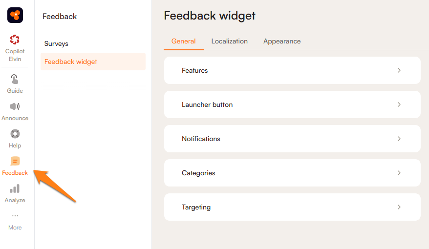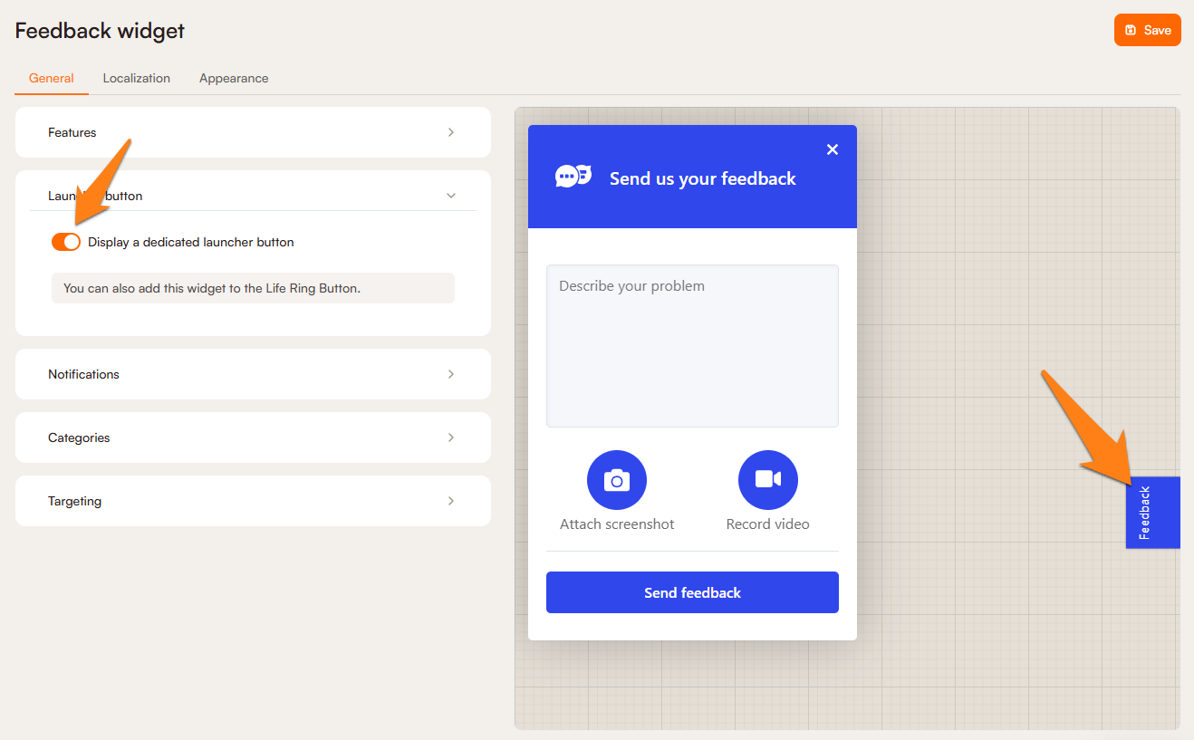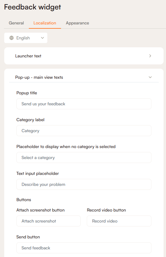 There are three settings sections for the Feedback widget: In the General section, you can choose the fields to display on your widget, configure your launcher button, choose how you'd like the feedback to be sent to you, and filter which URLs you'd like the widget to display on. In Localization, you can edit all the text fields on the widget and pop-up window, and in Appearance, you can choose display colours of the widget and pop-up.