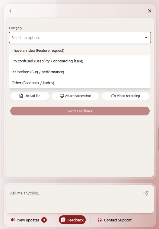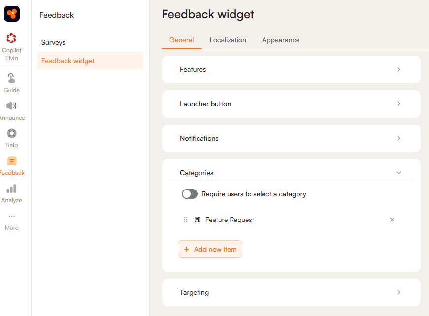 The Categories field helps organize feedback by letting users choose a category for their submission, making it easier for you to analyze and use the data. It can be added and configured under Feedback > Feedback Widget > General, where you can manage the drop-down options by adding, editing, or removing entries. It can also be set as mandatory, requiring users to select a category before submitting feedback.