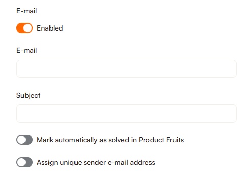 Within this menu you can also choose to mark the feedback as solved automatically in the Product Fruits feedback inbox and assign a unique sender e-mail address.