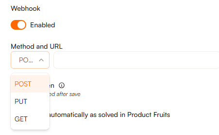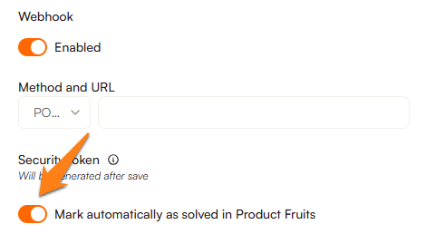 This is where the webhook security token will be displayed, in addition to the toggle if you'd like the feedback to be marked as solved automatically in the Product Fruits feedback inbox.