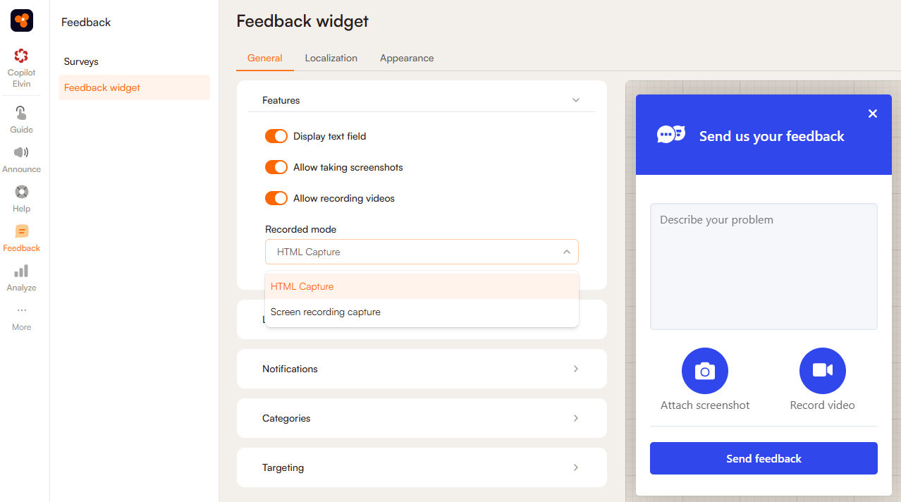 In the Features section, you can choose which items are enabled on your Feedback widget pop-up:
