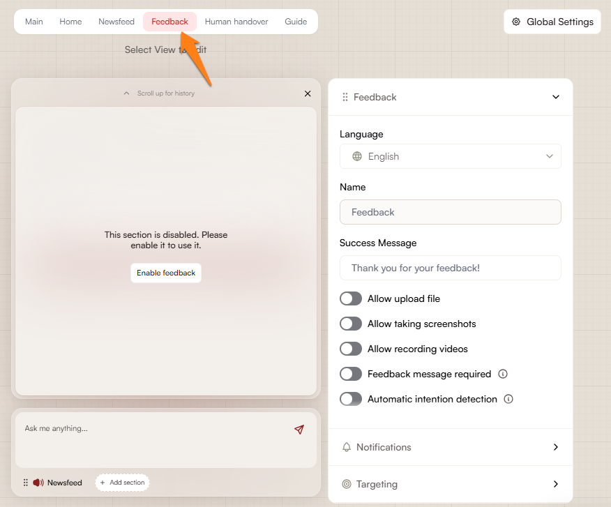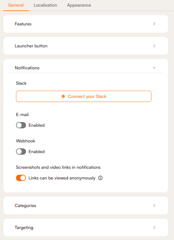 In Notifications, you can choose how you will receive the feedback your users submit. Connect your Slack here, or enable e-mail or webhook. You can also enable screenshot and video links to be viewed anonymously: