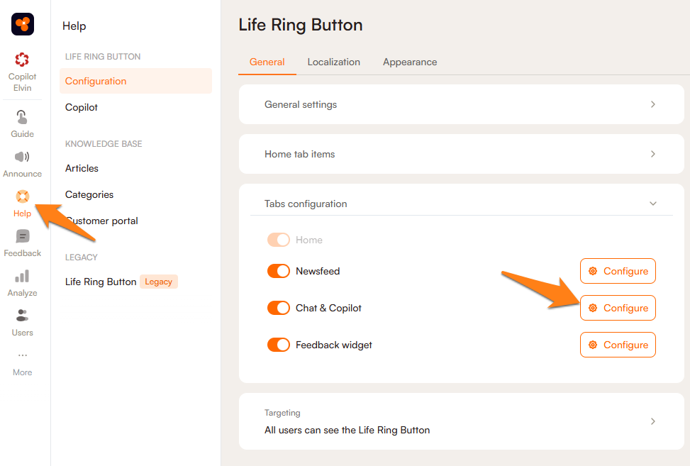 - Go to Help widgets -> Life Ring Button