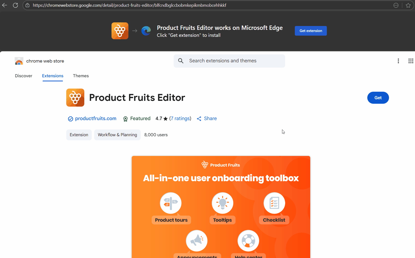The Product Fruits Editor works as an extension for any Chromium-based browser, allowing you to easily build onboarding tours, hints, and custom events. It also enables you to preview and refine all your Product Fruits content directly within your browser.