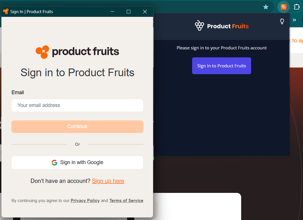 Once installed, log in using the same credentials you use for accessing the Product Fruits administration panel. Your login session is shared, meaning if you’re logged into the extension, you’re also logged into the administration panel (and vice versa). If you’re not logged in, you’ll be prompted to enter your credentials when opening the extension.