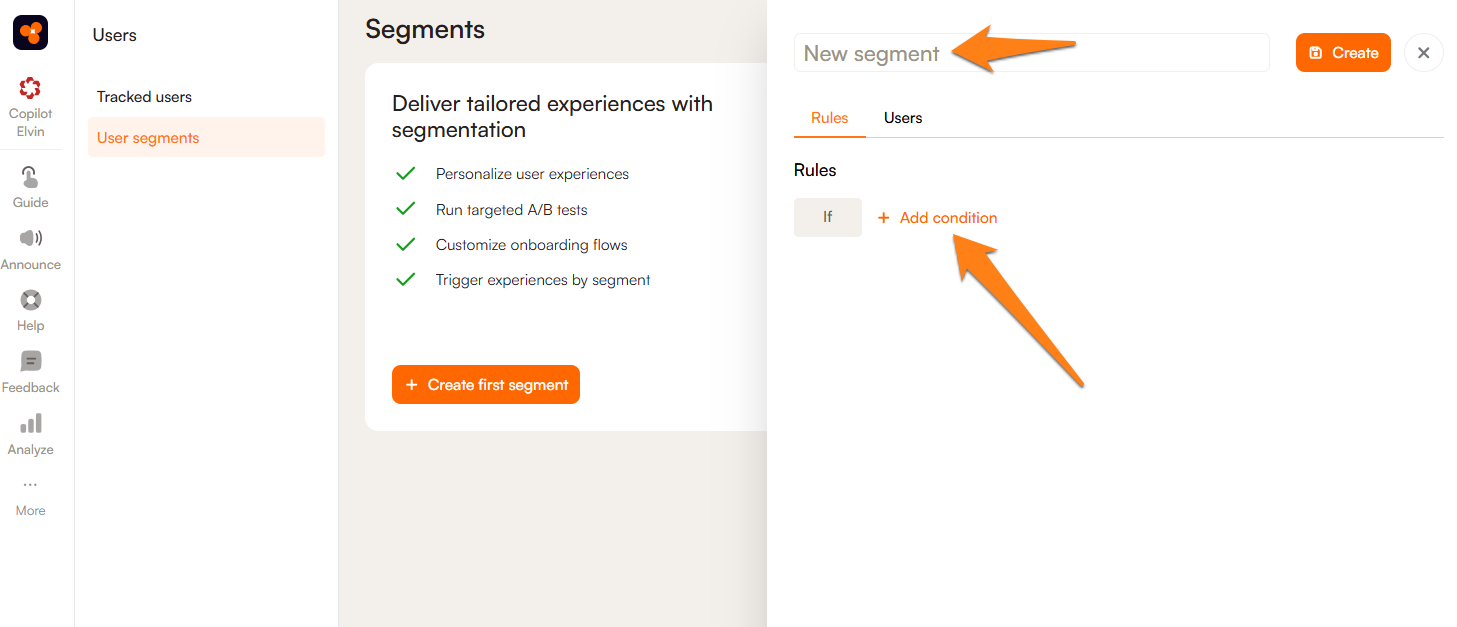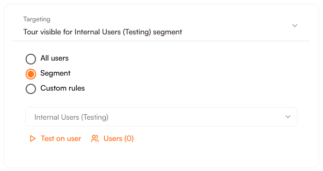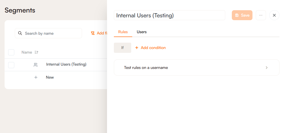 You'll want to make sure you name the segment in a way that you will remember and will not be confusing for any coworkers who will also be using Product Fruits. Here we have named our segment Internal Users (Testing):