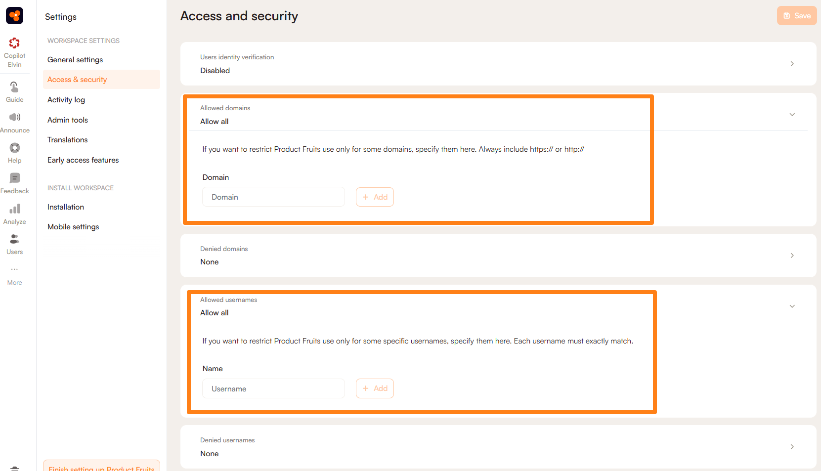 Once Product Fruits has been installed into your application, there are several ways to restrict who can see onboarding content until it is ready. In the Workspace Settings, you can restrict all Product Fruits content to a single domain or specific usernames.