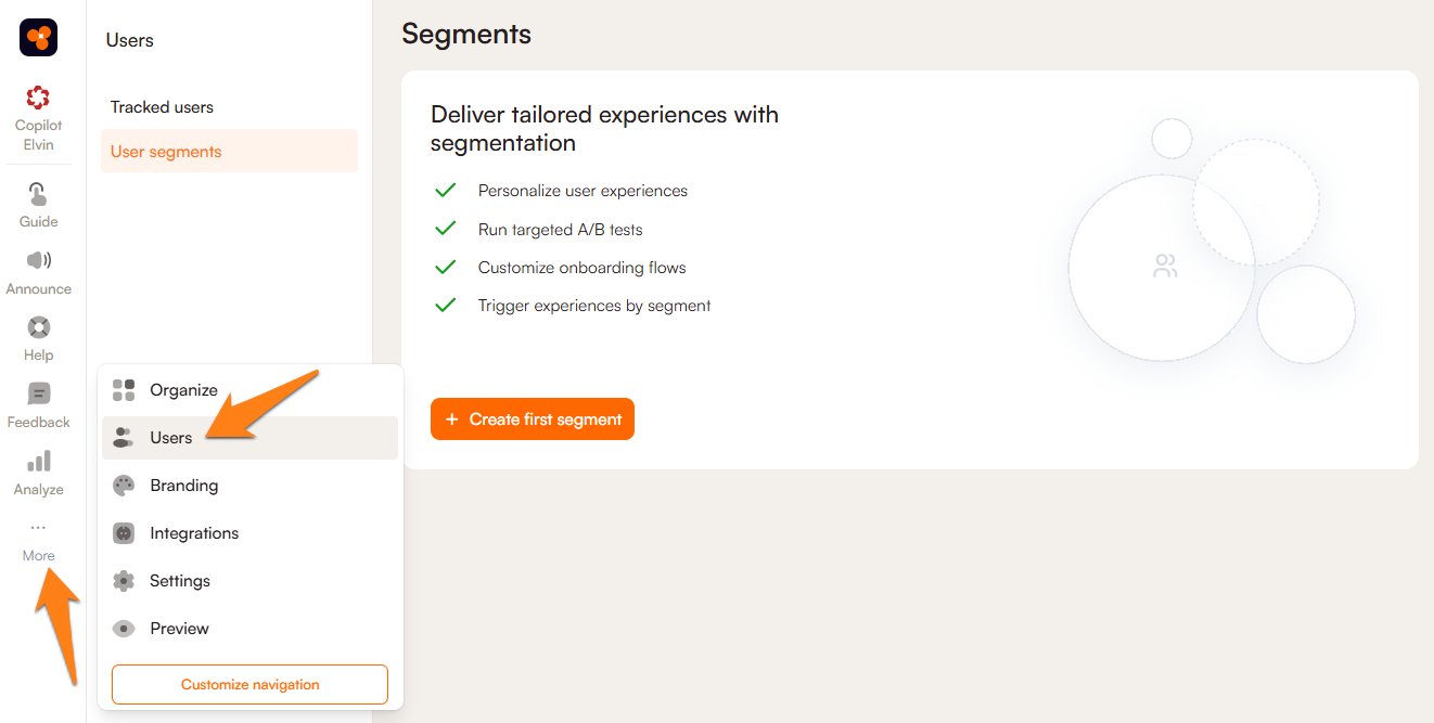To set up a segment based on email domain you will want to navigate to More --> Users --> User Segments and click Create first segment: