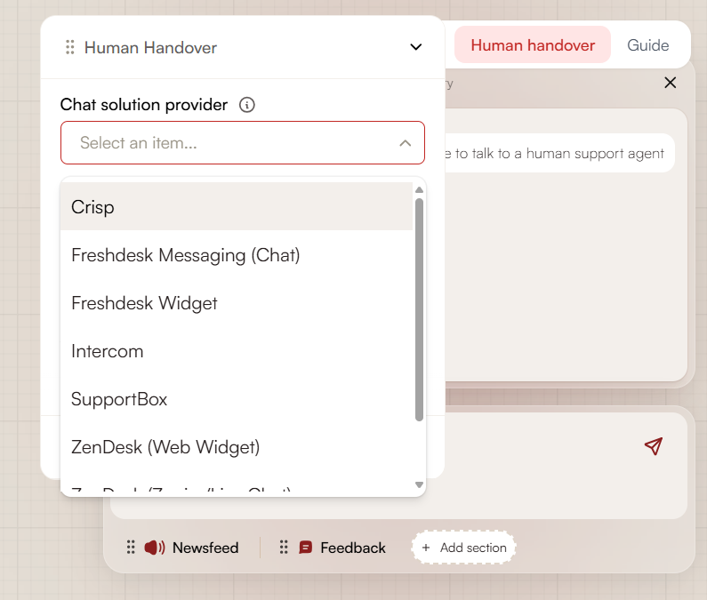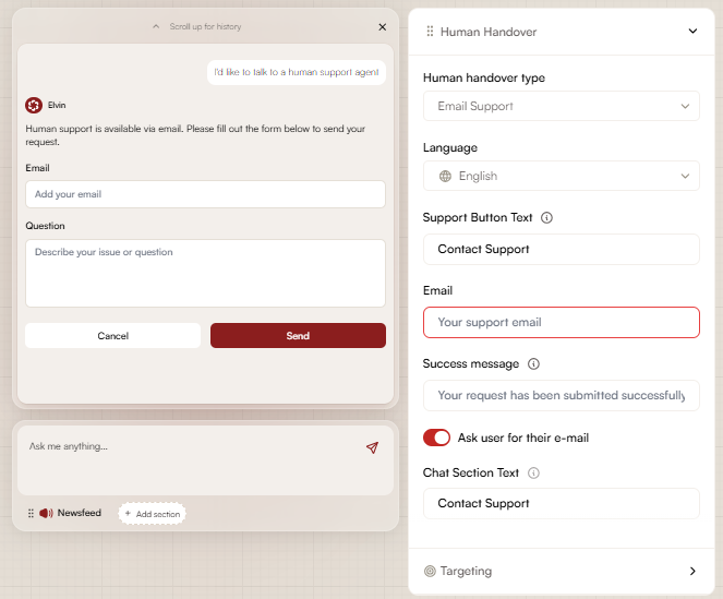 Elvin Copilot is used as the first layer of support. Human handover allows users to contact your support team when Elvin cannot help.