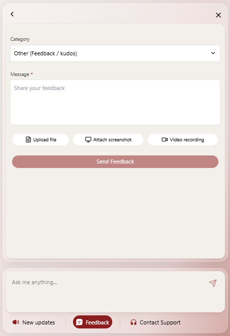 You can configure the support button text and provide the email address users should contact. After a message is sent, a success message is shown to the user.