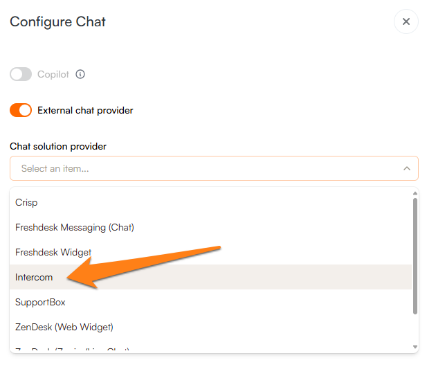 - On the next screen, select your chat provider. In this case, select Intercom.