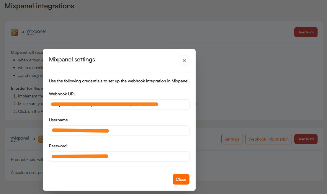 Now copy the Webhook URL, Username, and Password. Then go to the Mixpanel Custom webhook integration section and create a new webhook connection.