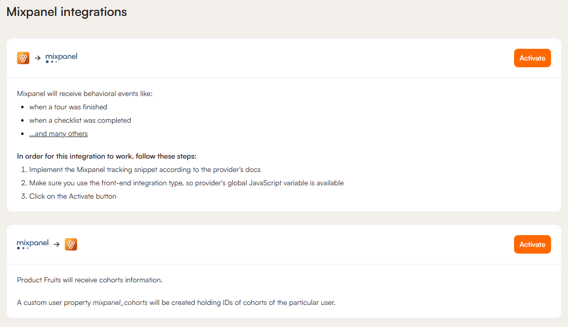 To activate the integration, go to Integrations -> Mixpanel and click on Activate.