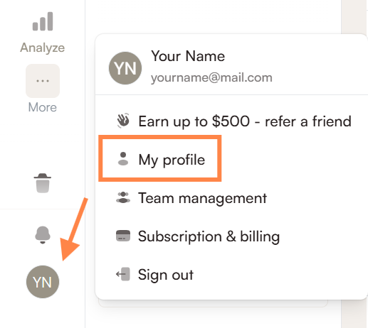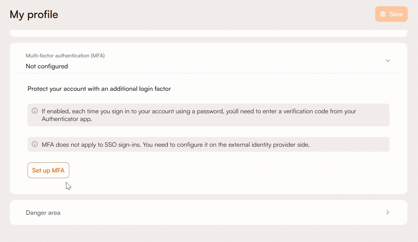 You can activate MFA by first navigating to the My profile settings by clicking and opening the menu in the bottom left of the administration.