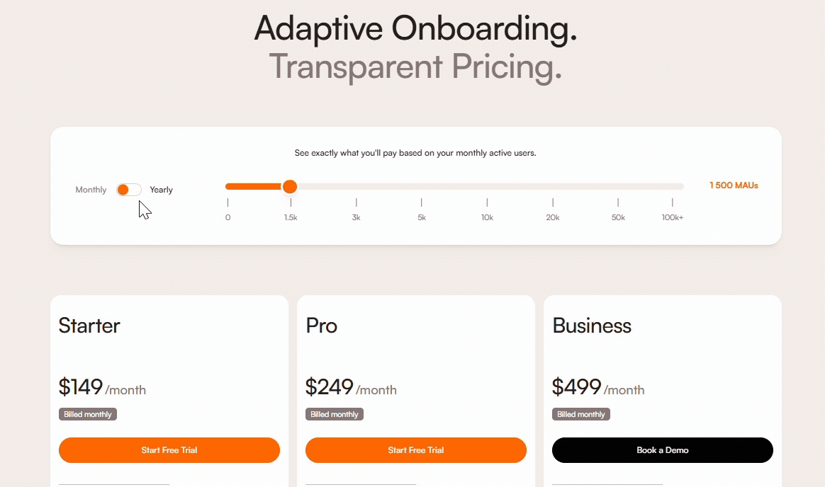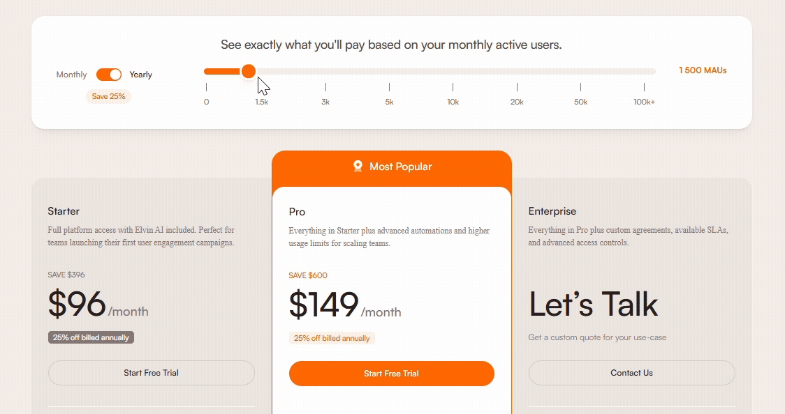 Each plan tier comes with its own set of available features, but all pricing tiers follow the same core principle: pricing is based on the number of unique monthly active users (MAUs) of your application. On our official pricing page, you can enter your estimated MAU count to see real-time pricing adjustments and explore a full comparison of features across all plans.