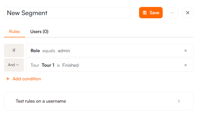 Use the dropdown Add Condition to select conditions like user role, device type, or completion of previous tours. Once your segment is set up, save it and apply it wherever needed.
